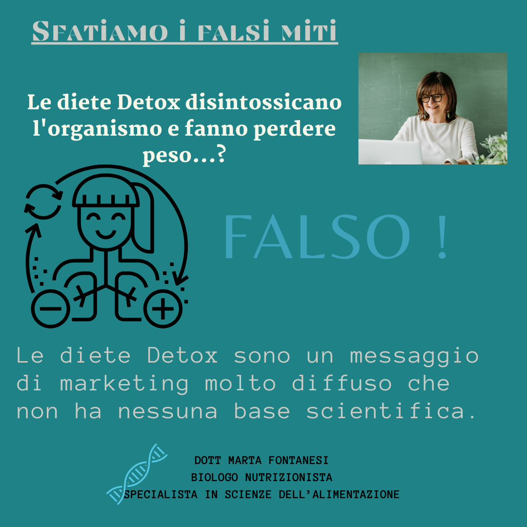Le diete Detox disintossicano l’organismo e fanno perdere peso…? FALSO! Le tossine e le sostanze in eccesso accumulate nel nostro corpo vengono regolarmente eliminate attraverso gli organi emuntori: fegato, rene, pelle, intestino, polmoni. Non esistono prodotti o alimenti che rendono il processo più rapido   Le diete Detox sono un messaggio di marketing molto diffuso…