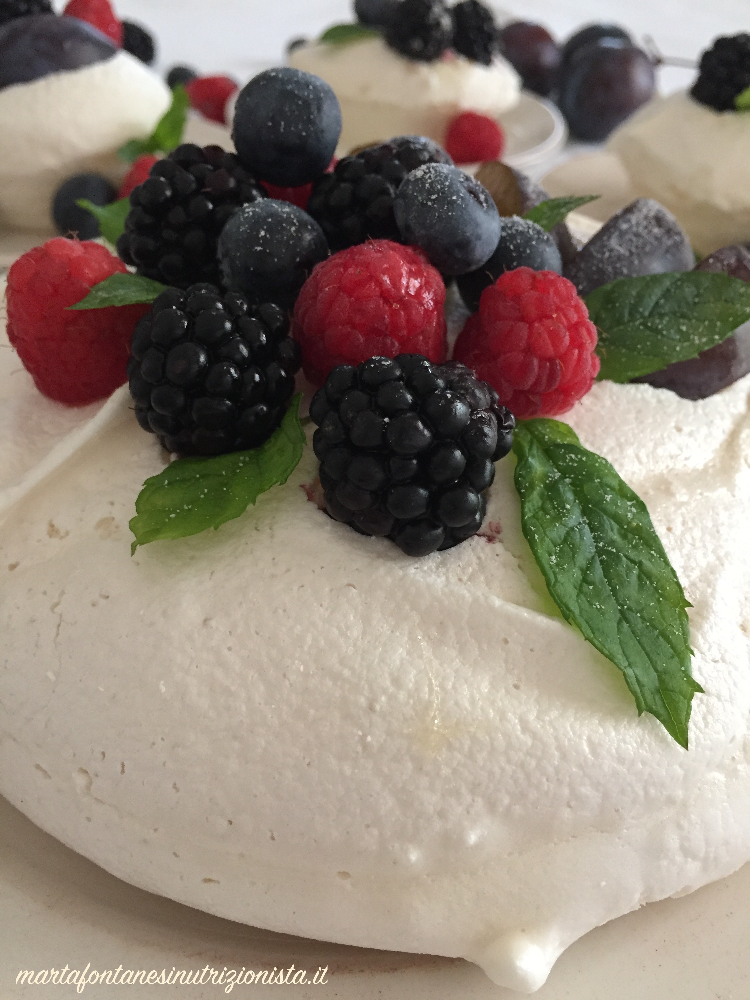 Ingredienti per 12 piccole Pavlova :  acquafaba (acqua di cottura dei ceci) ml 120, zucchero g 90, foglioline di menta per decorare. Procedimento: montate con le fruste l’acquafaba aggiungendo poco alla volta lo zucchero. Dopo circa 10 minuti avrete un composto simile all’albume montato a neve. Ricoprite una leccarda con carta da forno e disponetevi…