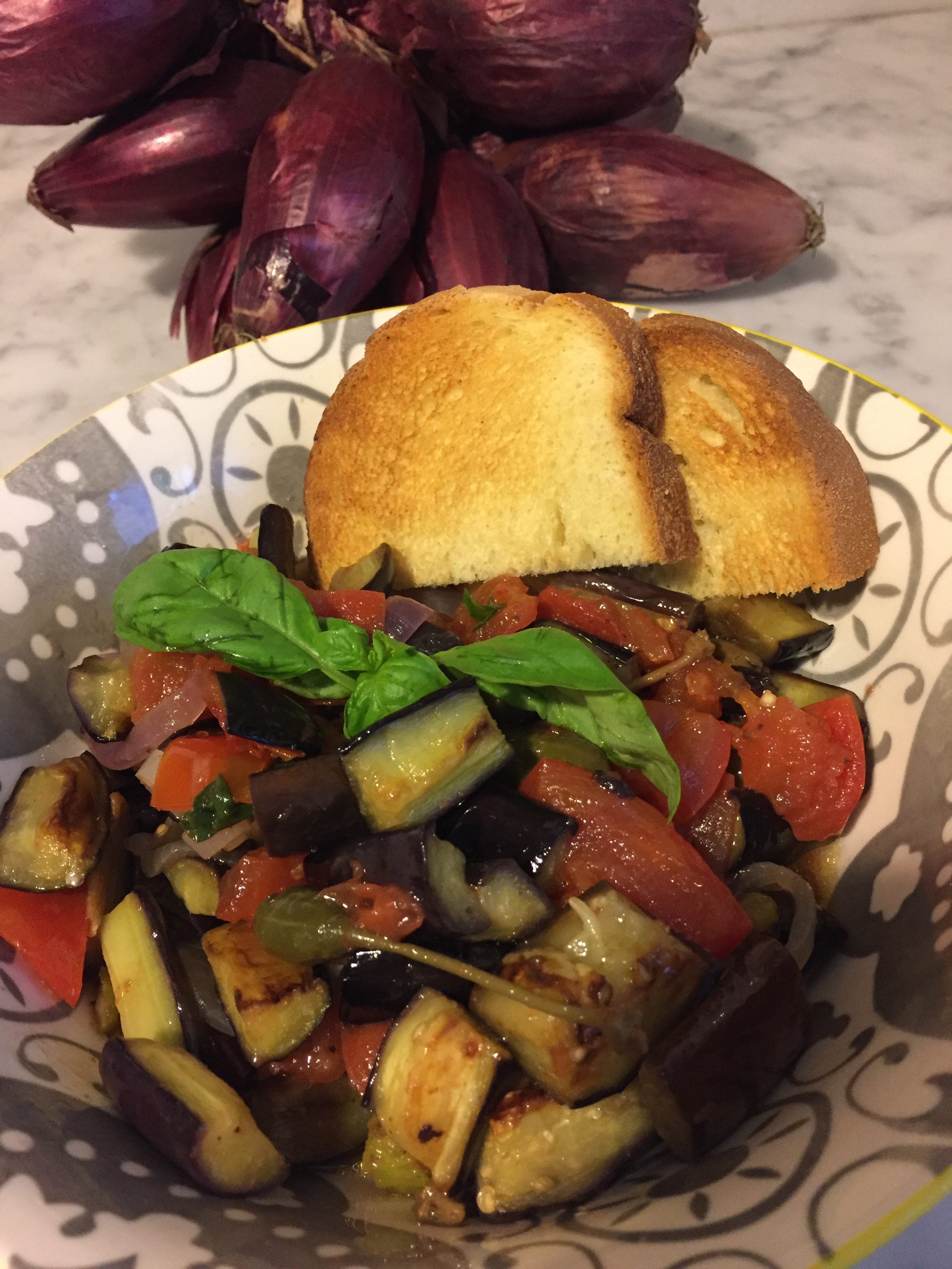 Ingredienti per 4 persone : 4 melanzane , 2 cipolle di Tropea, 10 foglioline di menta, 4 cucchiai da minestra di olio extravergine d’oliva, 4 spicchi d’aglio, 2 cucchiai da minestra di uva passa, 2 cucchi da minestra di pinoli tostati, 2 cucchiai da minestra di capperi giganti, 2 cucchiai da minestra di olive Taggiasche denocciolate.…
