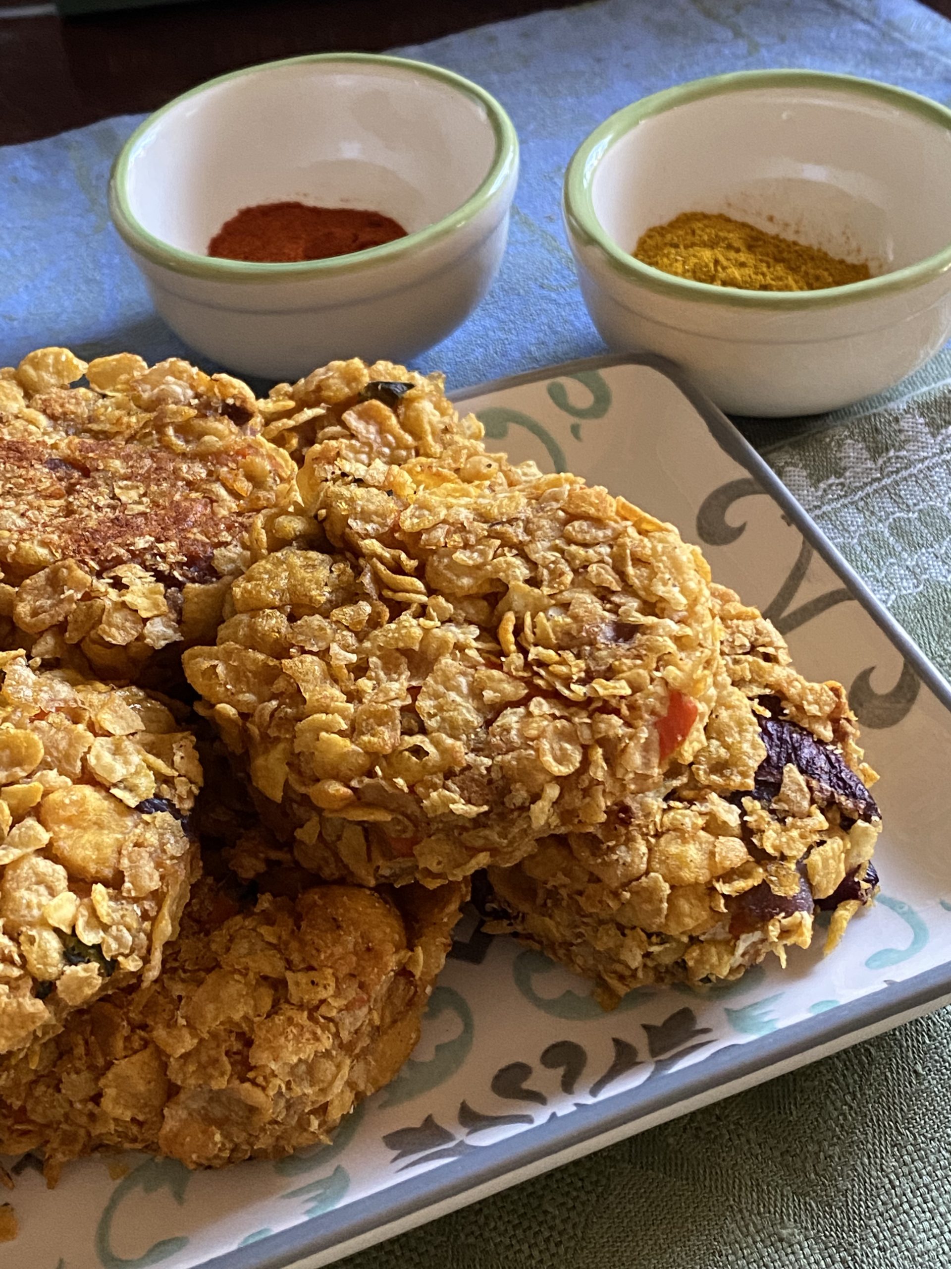 Ingredienti: verdure miste a scelta g 500 (io ho usato carote, cipolla, cavolfiore e broccolo), 1 patata media lessata, pane grattugiato 4 cucchiai da minestra,curry 1 cucchiaino da caffè, paprika dolce 1 cucchiaino da caffè, olio extravergine d’oliva, fiocchi di mais q.b. Preparazione:cuocere al forno le verdure per 30 minuti, tritarle grossolanamente al coltello e mescolarle…