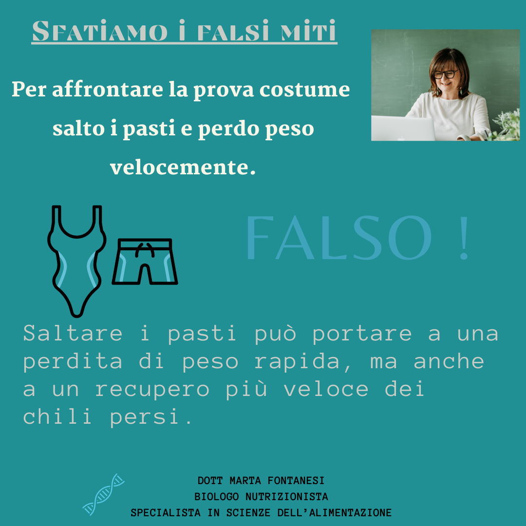 Saltare i pasti per perdere peso velocemente è una convinzione sbagliata e non salutare. Infatti i chili persi in questo modo si recuperano molto velocemente e spesso in quantità ancora maggiori. La soluzione migliore per arrivare sereni alla prova costume è avere uno stile di vita sano e attivo tutto l’anno, non solo a giugno!