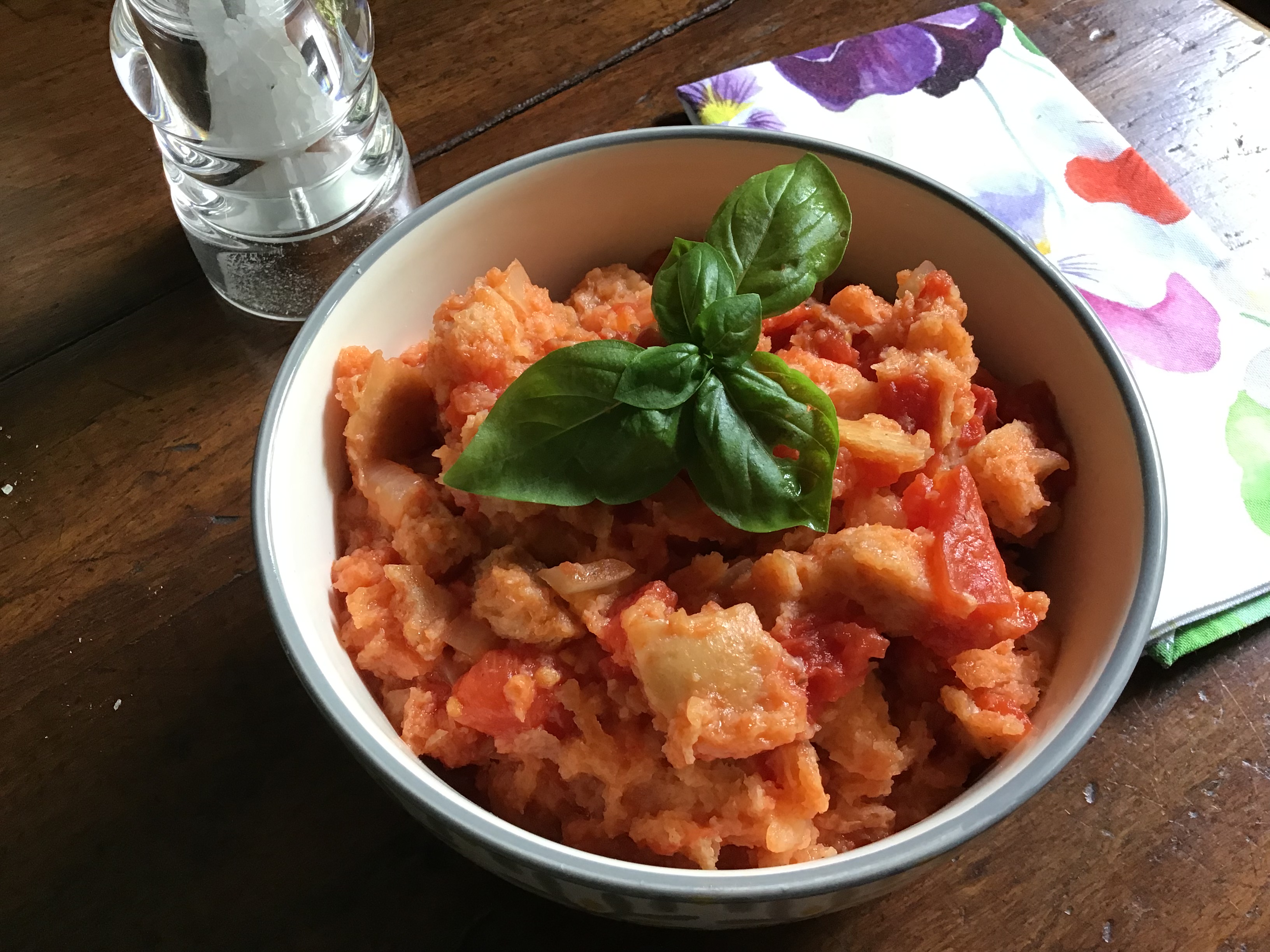 Ingredienti per 2 persone: Pane raffermo (meglio se toscano) g 100, Pomodori ramati n 2, Olio extravergine d’oliva 2 cucchiai da minestra, Brodo vegetale 200 ml, Basilico q.b., Sale e Pepe 1 pizzico.